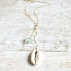 This cowrie shell and sea foam glass necklace is perfect for the beach lover.
