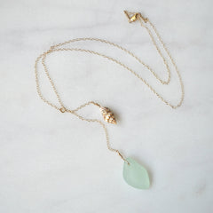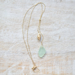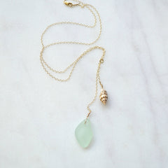 This ocean inspired necklace features a beautiful sea foam colored sea glass, found on the beaches of Hawaii. It dangles alongside a cute little nassa shell.